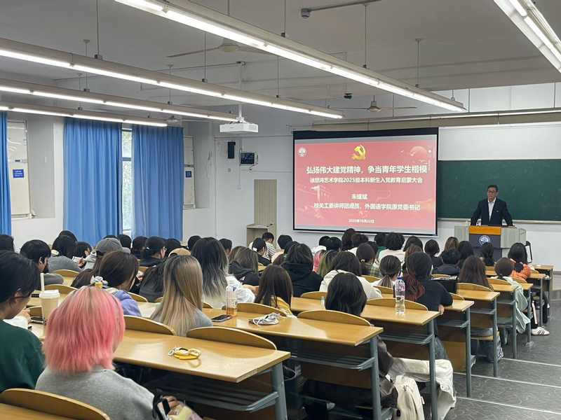 为引导新生深刻理解中国共产党的光荣传统与时代使命,激发政治热情与理想信念,号召同学们积极向党组织靠拢。10月22日下午,徐悲鸿艺术学院在第一教学楼1A302举办2025级本科新生入党启蒙教育大会。校关工委讲师团成员、外国语学院原党委书记朱耀斌应邀主讲,学院党委副书记兼副院长赵睿、团委书记李毅、新生辅导员常珊及全体2025级本科新生参加。